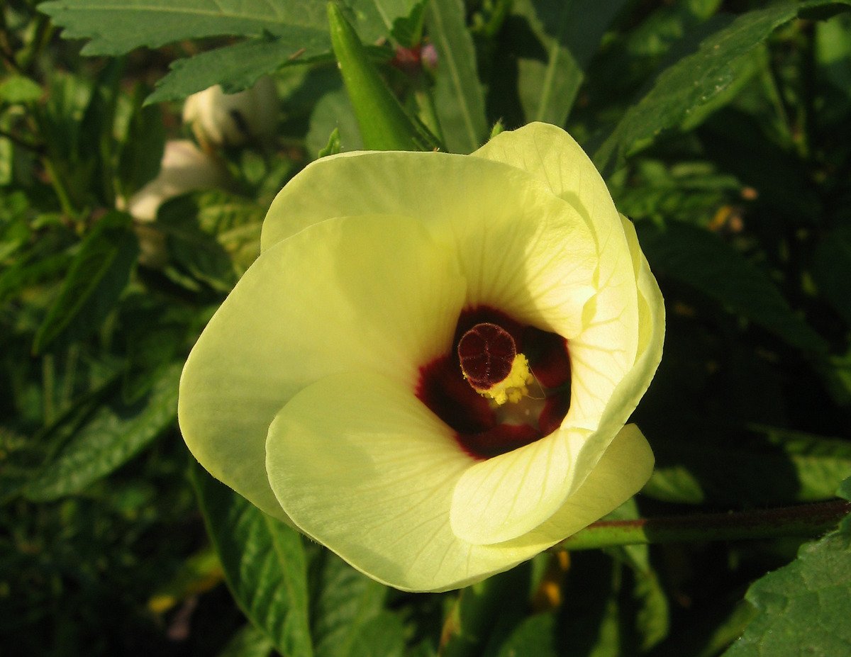 Во время цветения очень сложно сразу сказать, что за растение обосновалось на грядке – овощ или цветок? Цветки у бамии крупные, светло-желтого цвета и имеют форму, типичную для мальвовых, напоминая гибискус, лаватеру, малопу или немахровую мальву. После цветения на их месте образуются оригинальные плоды, способные еще больше ввести в заблуждение начинающих огородников – то ли это крупный стручок, то ли небольшой перец.