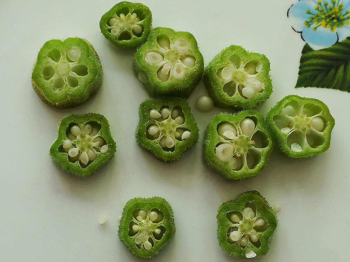 Благодаря работе селекционеров плоды окры стали не менее привлекательны, чем ее крупные цветы. Например, у сортов бамии «Алабама ред», «Джинг» и некоторых других стручки имеют ярко-красный оттенок. Кстати, благодаря наличию граней при разрезе стручков образуются очаровательные звездочки, которые могут украсить любое блюдо.