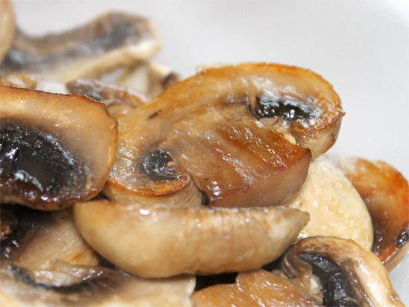 5. Сверху выкладываем, нарезанные пластинками, шампиньоны. Посыпаем базиликом, зеленью и поперчим.