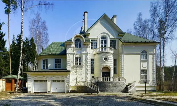 Особняк с фисташковым фасадом и белыми колоннами эффектно смотрится на фоне многочисленных зеленых насаждений. Он со всех сторон окружен сосновыми деревьями, по которым прыгают белки, а между растениями разбит искусственный пруд с небольшим мостиком. В пруд постоянно подается кислород, за счет чего круглогодично в нем живут декоративные рыбки.