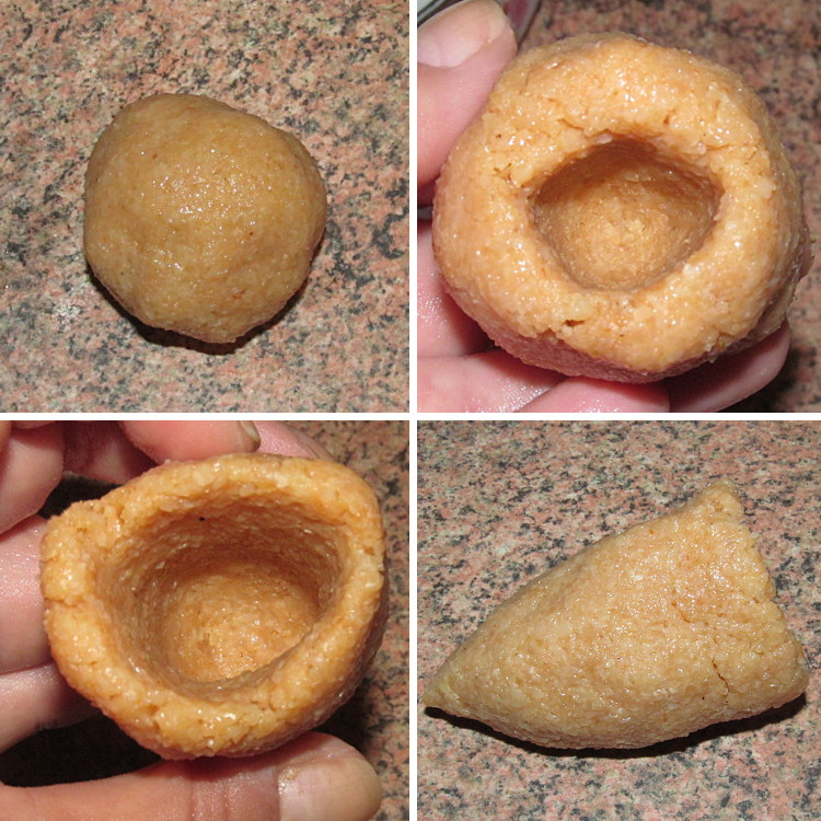 Отрываем от теста кусочек, по размеру чуть больше грецкого ореха и скатываем в шарик. Далее, держа его в левой руке указательным пальцем правой руки делаем углубление, постепенно расширяя стенки котлеты (смотрите фото).