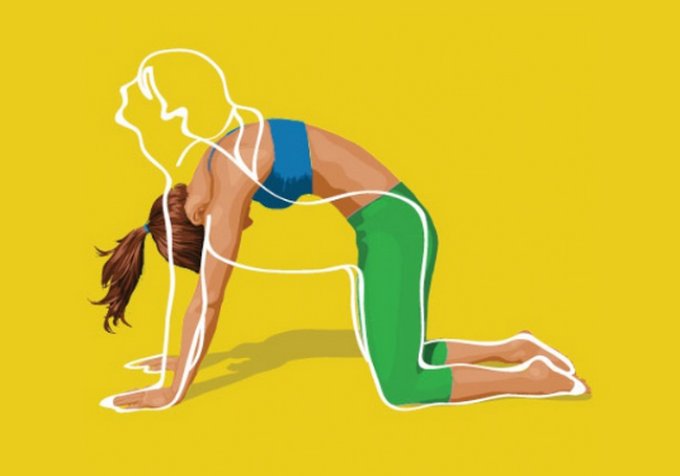 «Злая кошка». Встаньте на колени, обопритесь на ладони. Максимально вдохните носом, втягивая живот под рёбра, выгните вверх спину. Опустите голову вниз к груди. У вас должна получиться поза «h» – поза злой кошки, когда она внезапно встретилась с собакой. Задержали дыхание, на счёт восемь выдохнули, расслабились. Вернулись в исходное положение. Повторяем три раза.