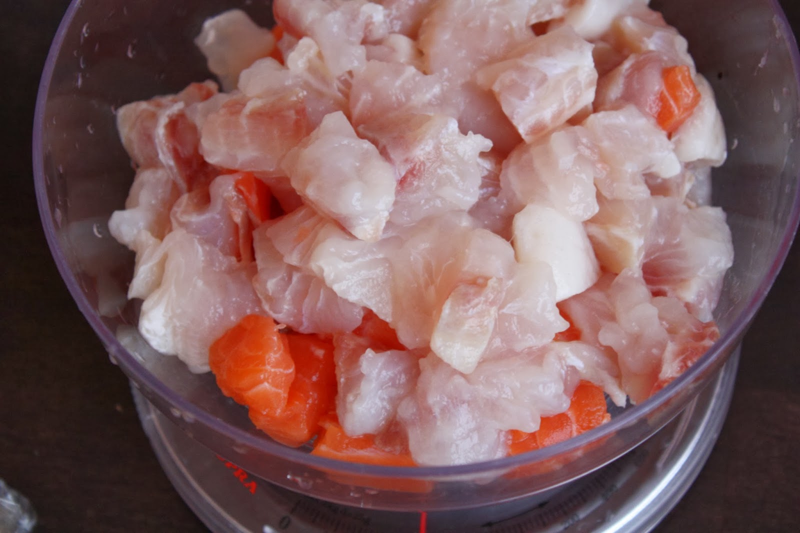 Займемся начинкой. Рыбу порежем небольшими кубиками. Можете взять какую-то одну рыбу.