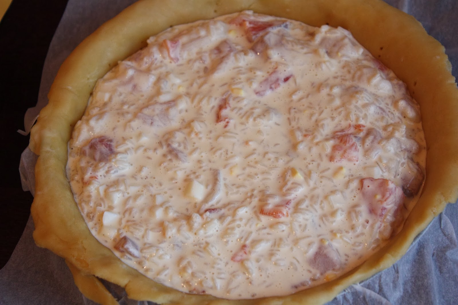 Тесто здесь песочное, за счет него пирог получается очень легкий, а во-вторых, в начинке плавленый сыр, О, ДА!!!! очччень нежная начинка получается, фантастическая просто!!! нежная нежность)))