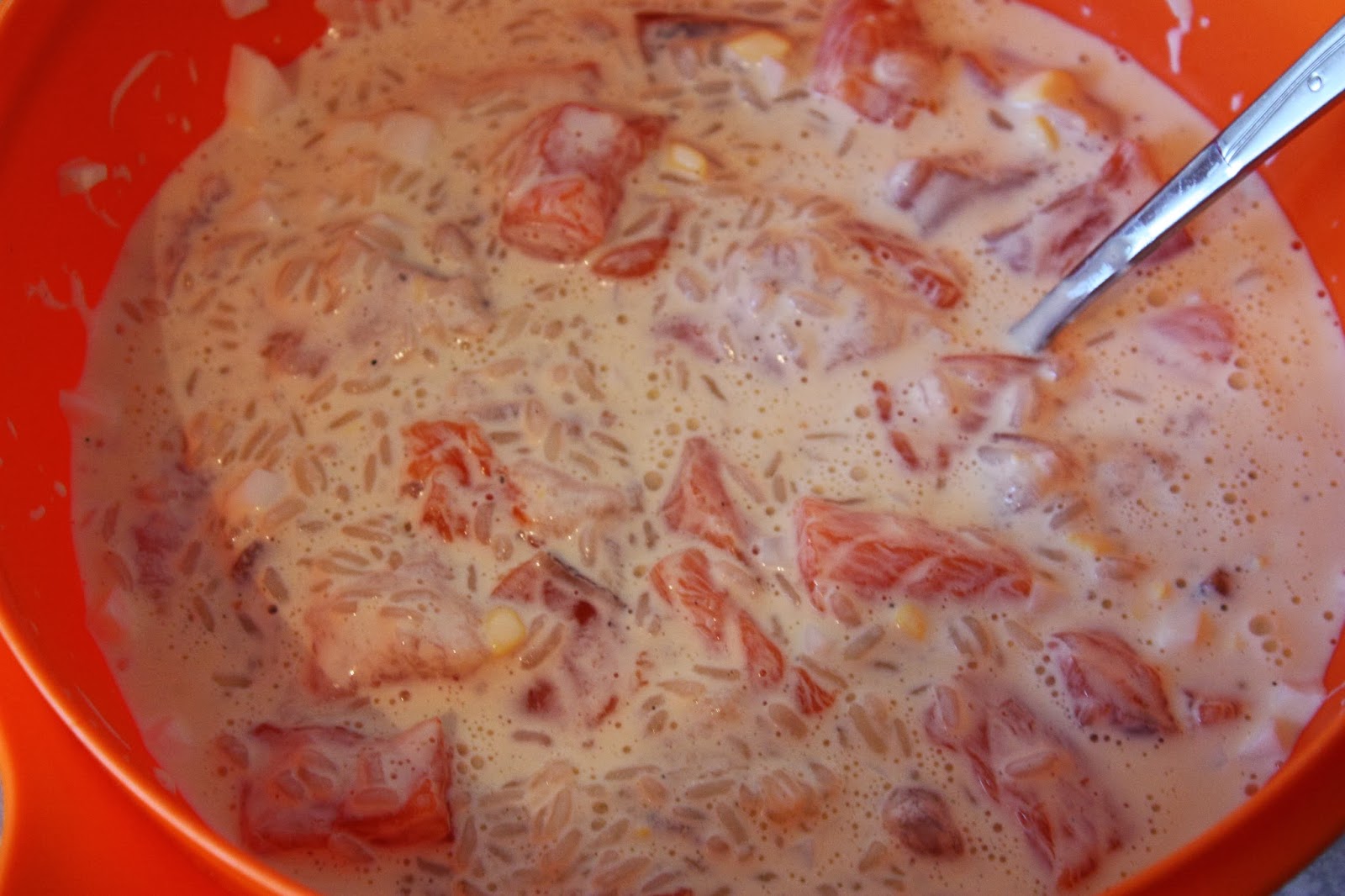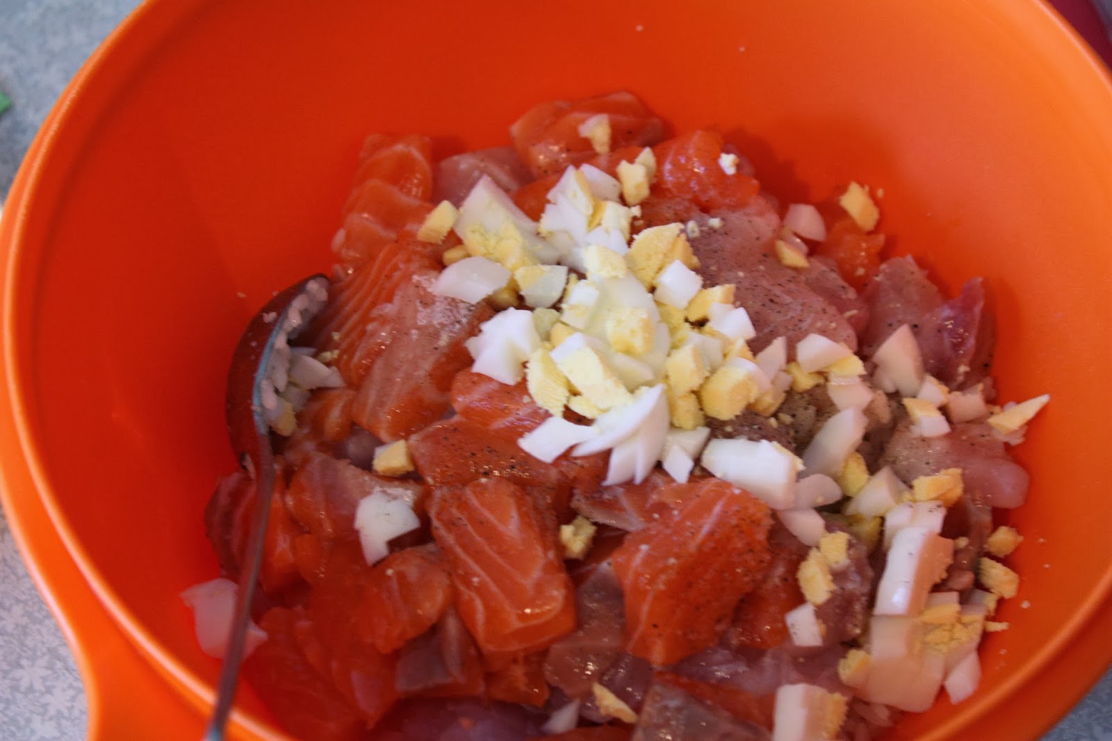 В миске соединим рыбу, отварной рис, порубленное яйцо, посолим и поперчим.