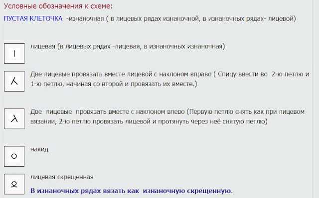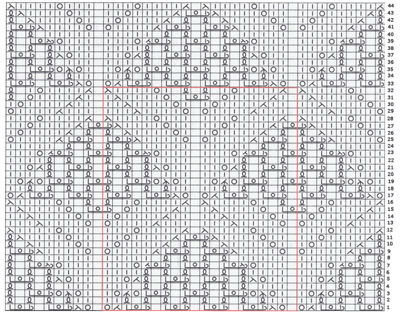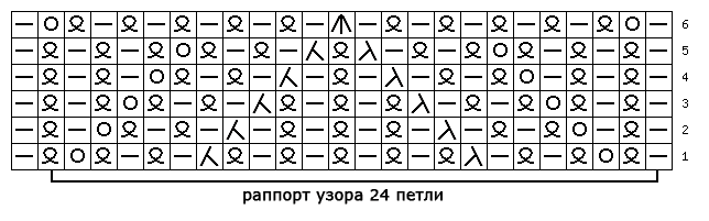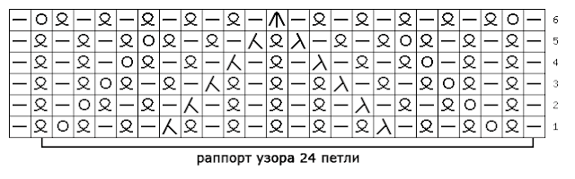 В схеме указаны и лицевые и изнаночные ряды. Раппорт узора 24 петли в ширину и 6 рядов в высоту.
