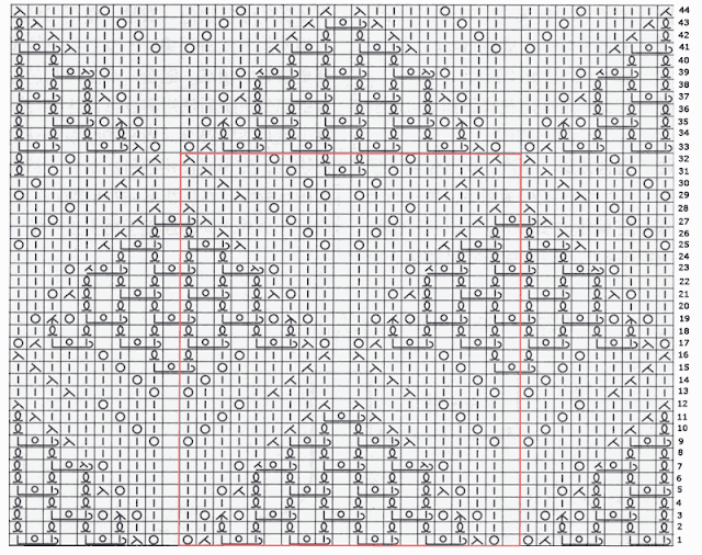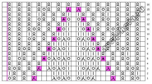 Раппорт узора 28 петель( + 1 для симметрии узора) , в высоту повторяем с 1-го по 16-й ряд.