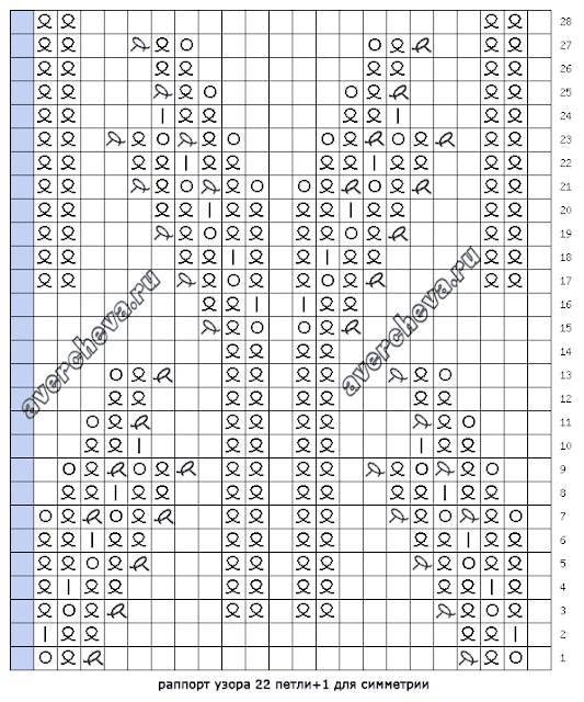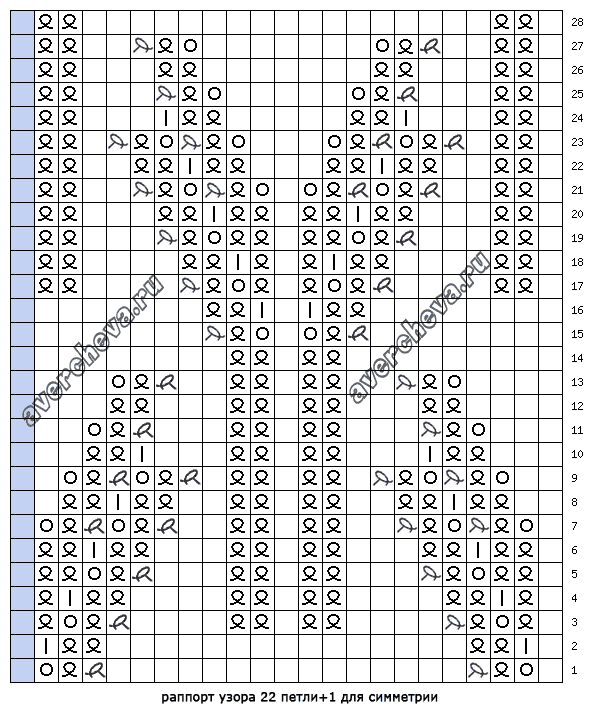 Раппорт узора 22 петли в ширину +1 (голубая клеточка) для симметрии. В высоту повторяем с 1-го по 28 ряд.