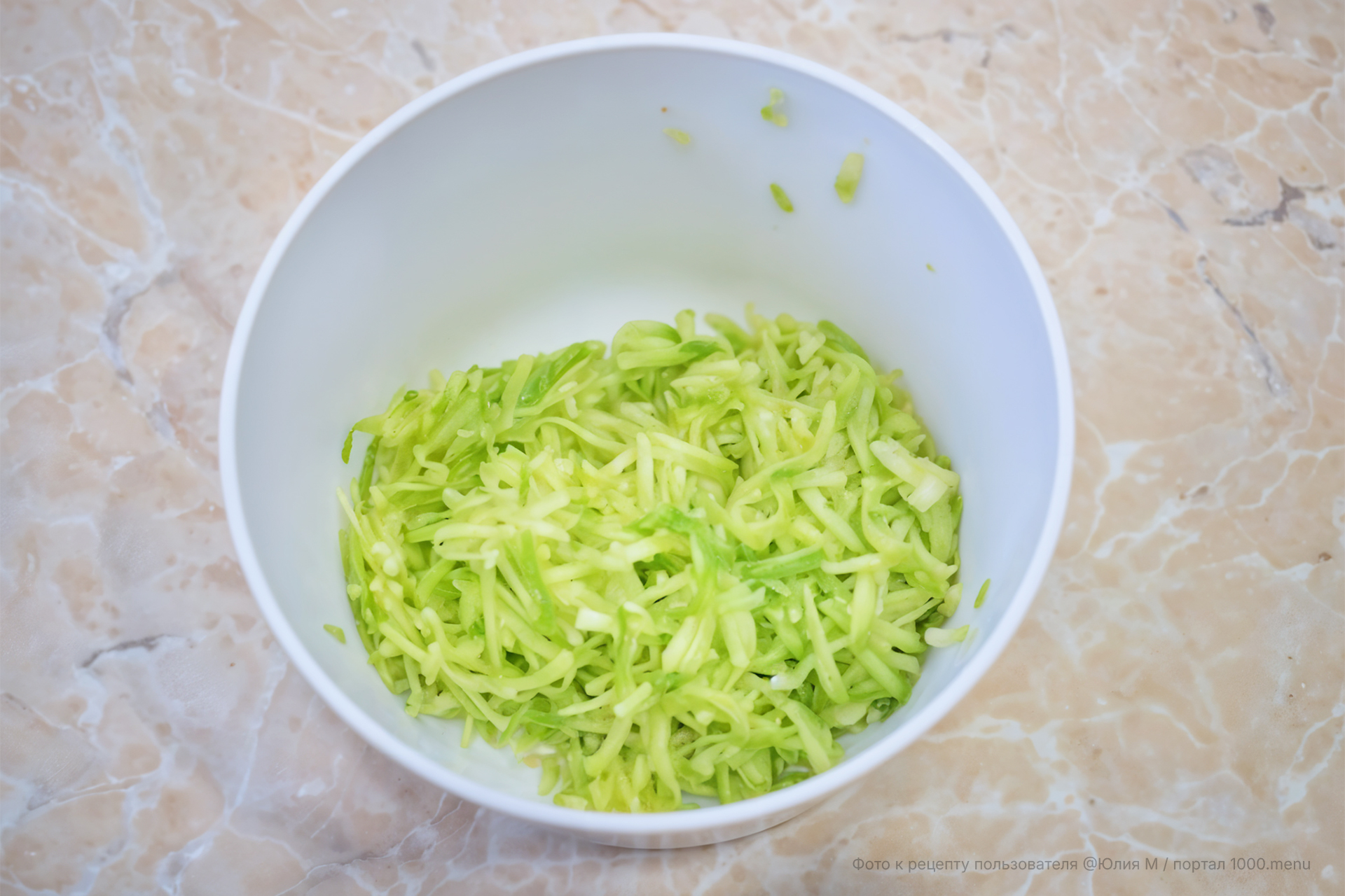 Шаг 1. С помощью овощечистки или ножа удалите с кабачка кожицу и уберите семена. Если кабачок молодой, достаточно только хорошо помыть его. Крупно натрите овощ, отожмите и слейте жидкость.