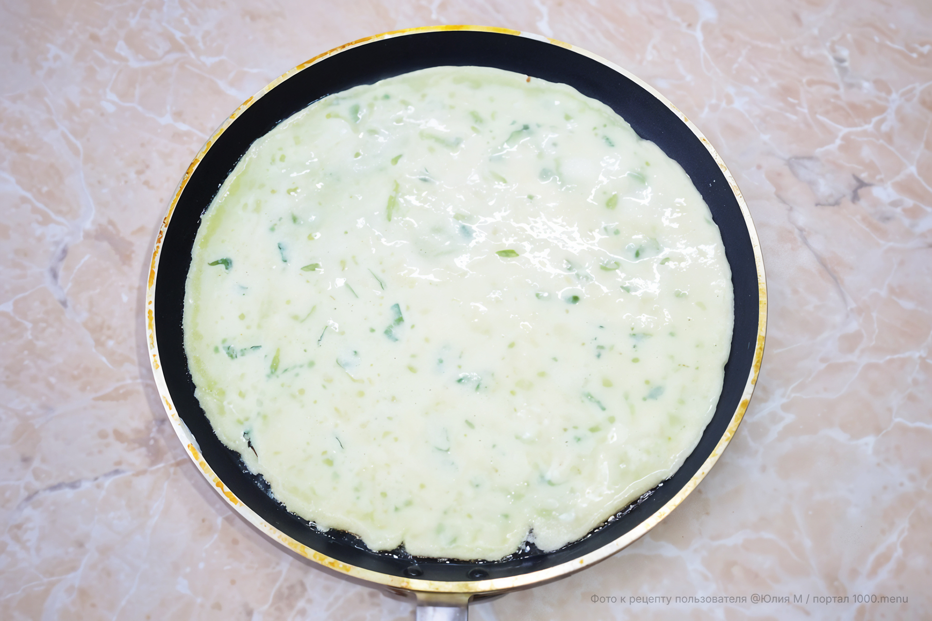Шаг 4. Порубите зелень и добавьте в тесто. Перемешайте и приступайте к выпеканию. Смажьте сковородку маслом (если используете), на горячую поверхность выливайте тесто — примерно половину половника, чтобы оно равномерно покрыло дно. Пеките блинчики с двух сторон до румяности.