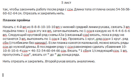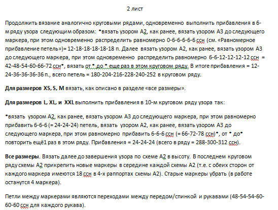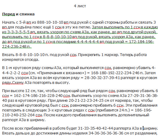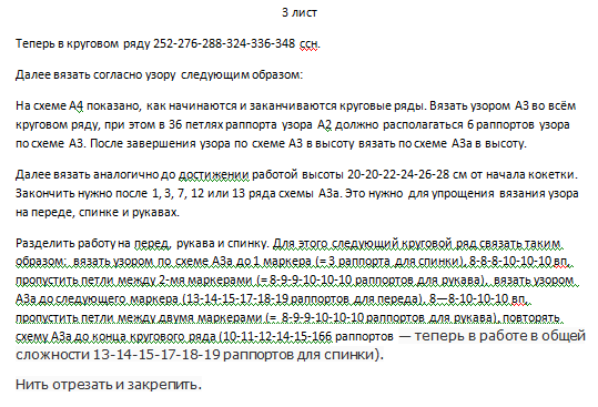 Вязание начинается сверху, с круглой кокетки, переходит на вязание переда/спинки (также круговыми рядами). В последнюю очередь круговыми же рядами вяжутся нижние планки рукавов.