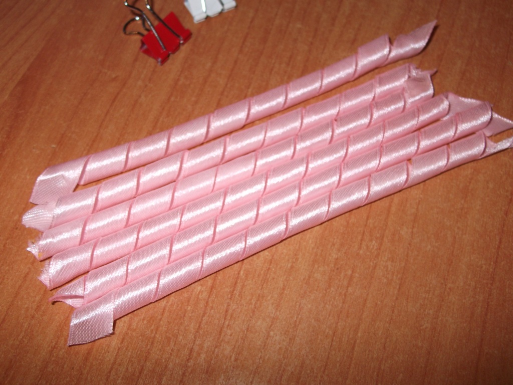 Делаем спиральки. Я делала их очень просто и быстро - ничего не пекла и не варила. Узкую ленту наматываем на карандаш или палочку, закрепляем с двух концов.