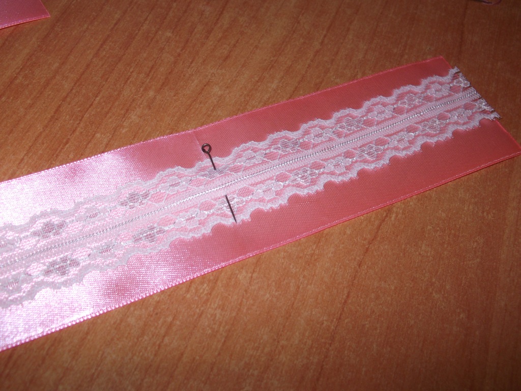 Кладем узкое кружево по центру ленты и скалываем булавкой, чтоб ничего не смещалось,