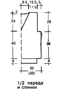 Через 38 см = 84 р. От резинки выполнить убавки для проймы, как для спинки.
