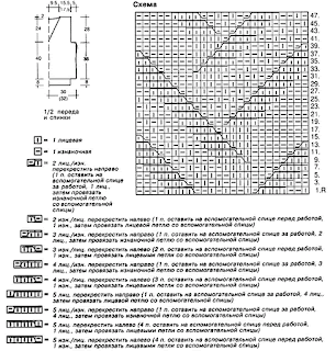 Для скоса выреза закрыть с внутреннего края работы 13 раз по 1 п. В каждом 4-м р. И 2 раза по 1 п. В каждом 2-м р. Следующим образом: для правого искоса последние 7 петель провязать так: 2 п. вместе изнаночной скрещенной, 4 п. лиц. глади, кром .;