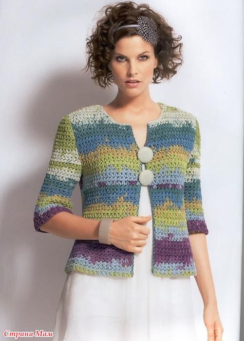 Этот жакетик связан из толстой секционно окрашенной пряжи, но, думаю, можно такой связать из однотонной или остатков пряжи.