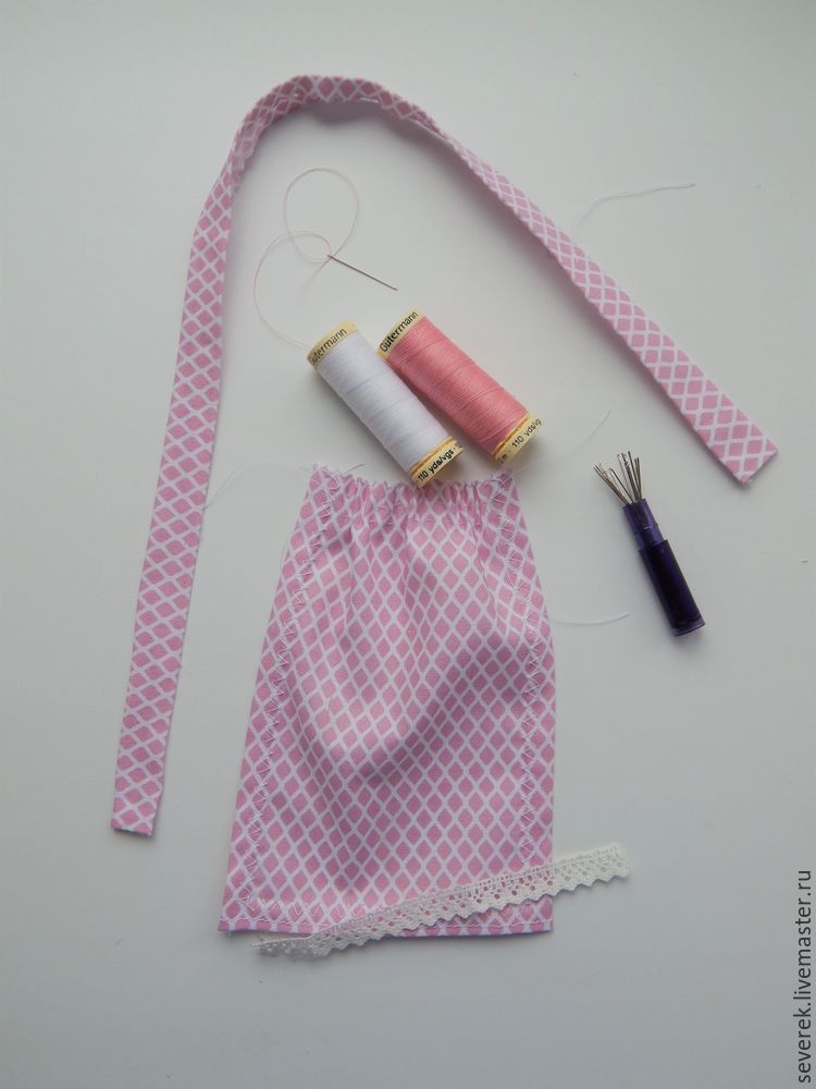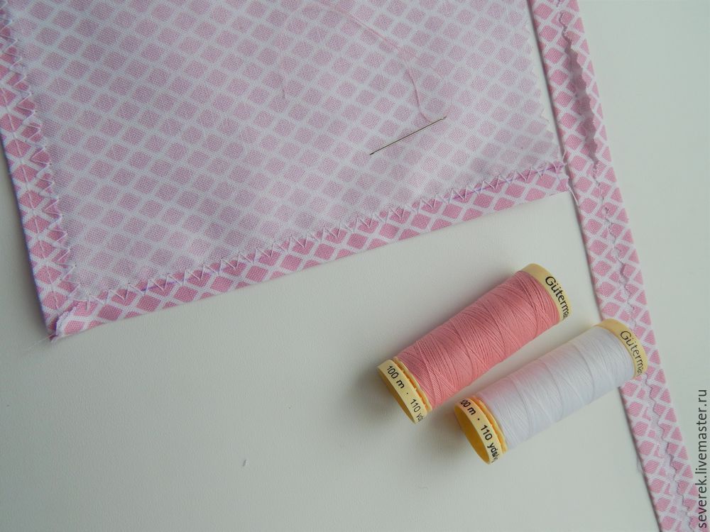 Фартук: проглаживаем сгибы, прошиваем зиг-загом. Поясок предварительно проклеиваем, вшиваем внутрь фартук.
