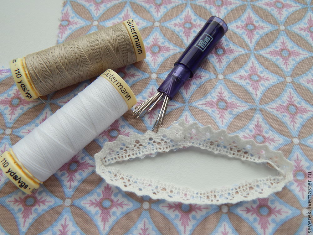 Намечаем середину и вырезаем горловину, декорируем кружевом.