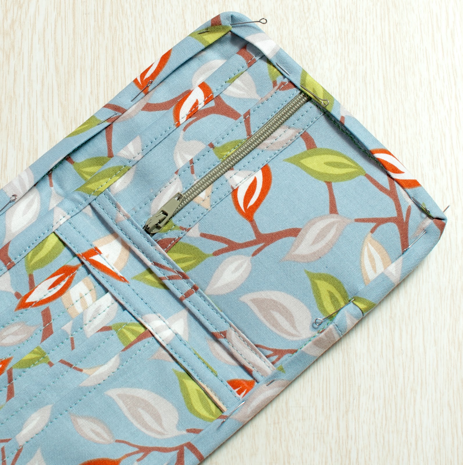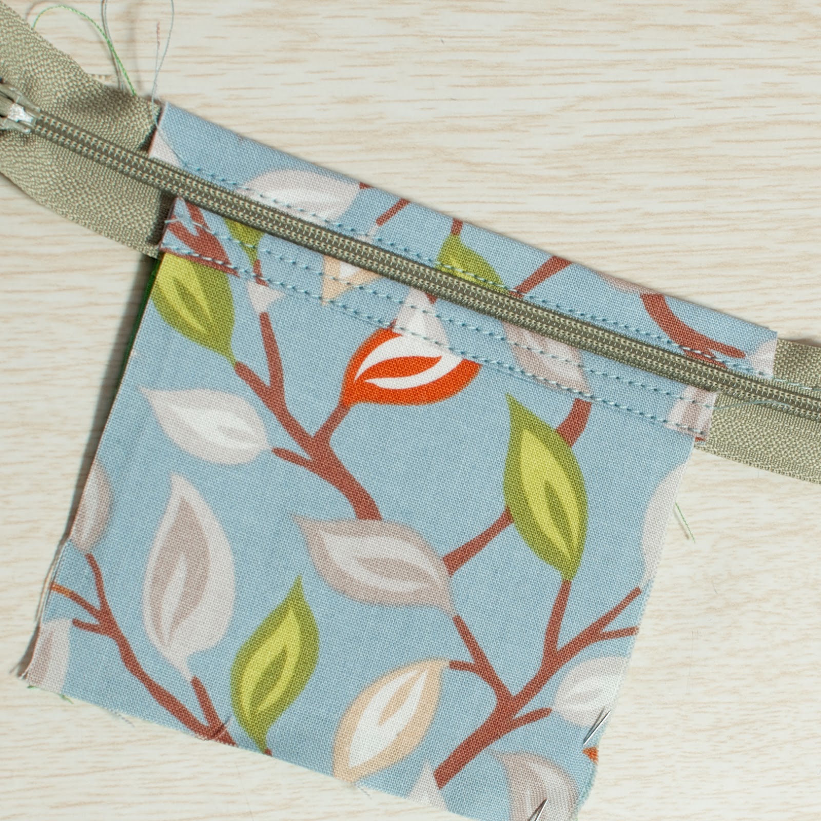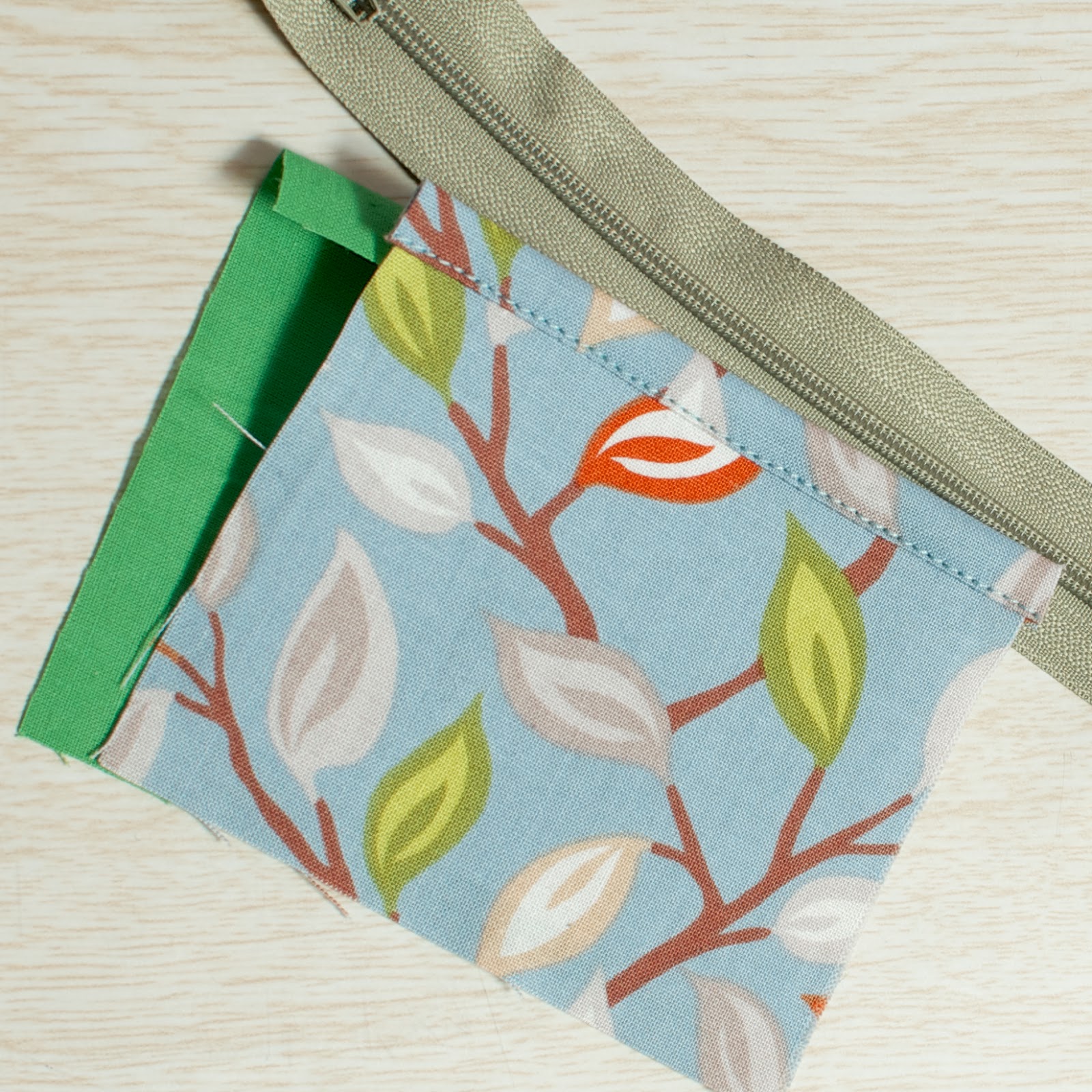 На подкладе загибаем 1 см внутрь (у нас при раскрое подклад был на один см больше основной ткани), совмещаем изнаночными сторонами две детали и между ними вставляем молнию. Прокладываем строчку.