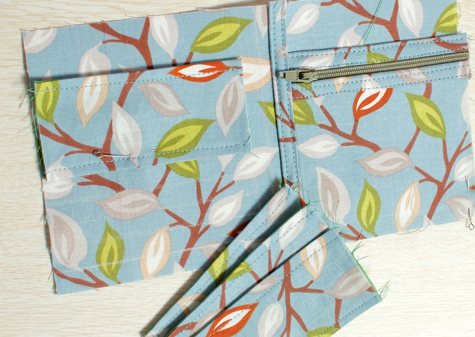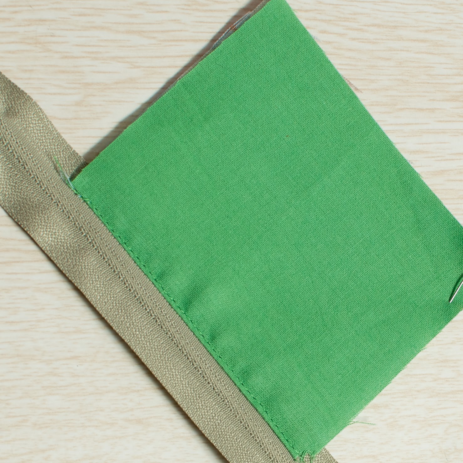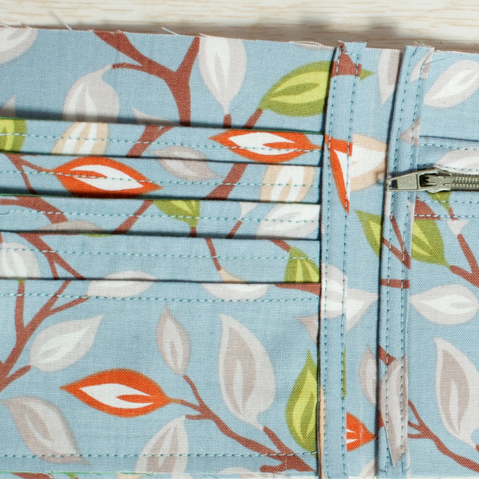 На подкладе загибаем 1 см внутрь (у нас при раскрое подклад был на один см больше основной ткани), совмещаем изнаночными сторонами две детали и между ними вставляем молнию. Прокладываем строчку.