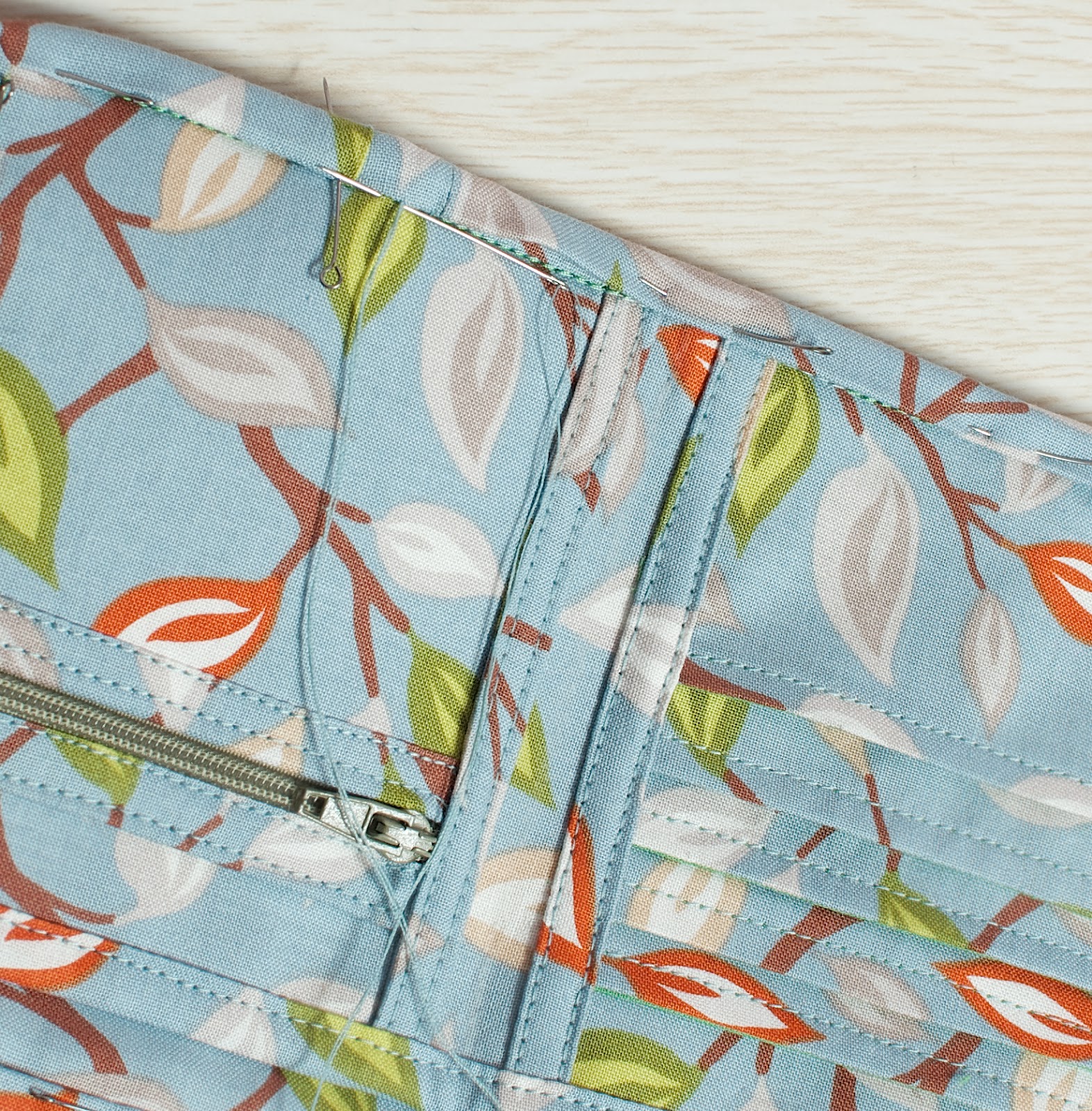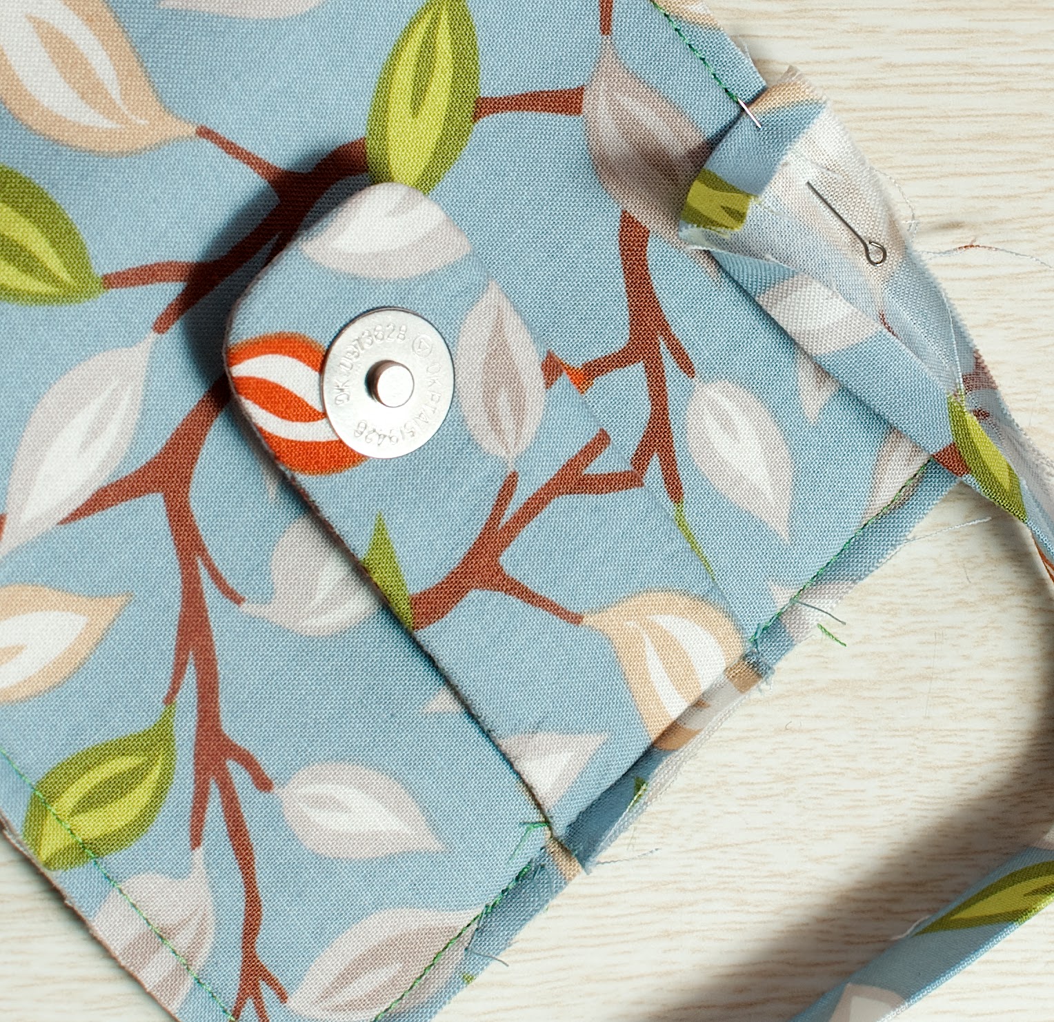 16. Заворачиваем косую бейку на внутреннюю часть и закрепляем булавками. Уголки аккуратно загибаем внутрь.