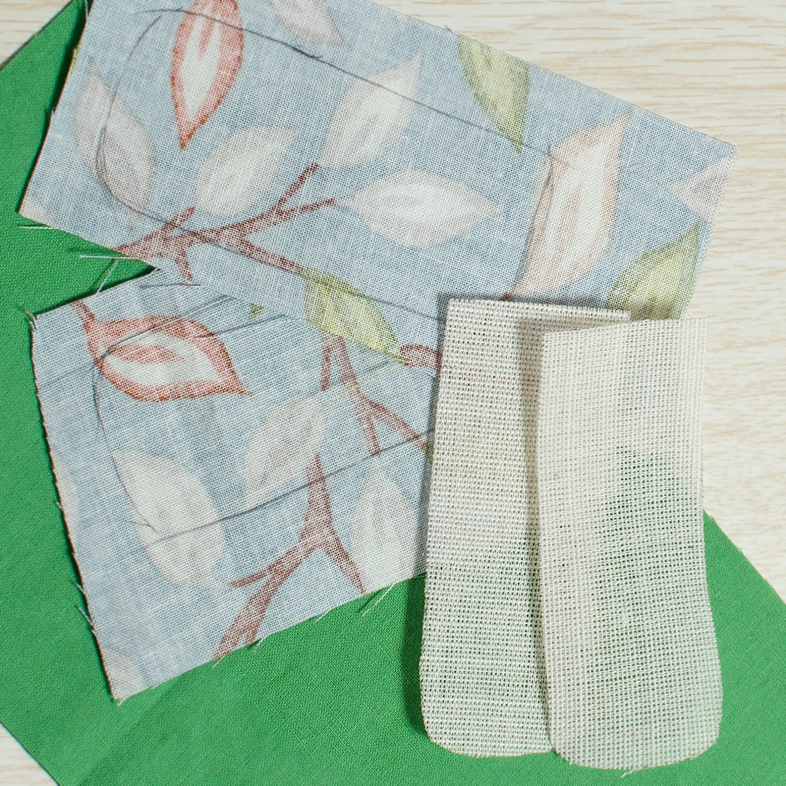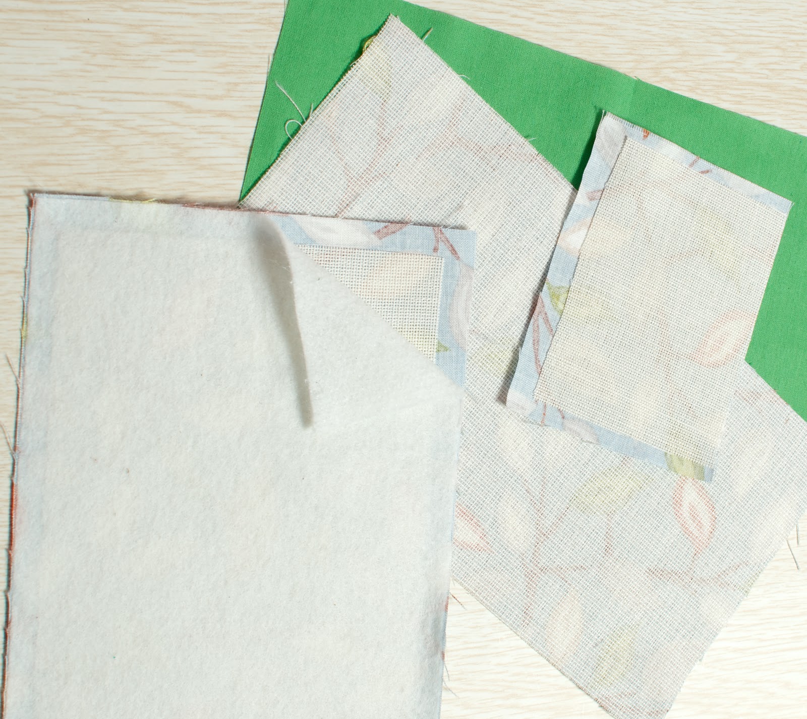 1. На главную внешнюю часть: 2 детали из основной ткани 14х22 см, 1 деталь из клеевой бортовки 12х20 см, 1 деталь из объемного флизелина 14х22 см.