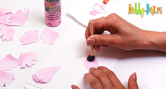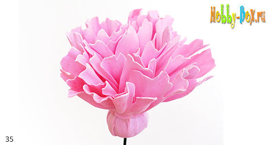 Лепестки пиона имеют неоднородную окраску, и каждый лепесток уникален, поэтому с помощью краски создаем эту неоднородность. Тонируйте каждый лепесток по-разному: то темнее ближе к основанию, то к краю лепестка. Таким образом необходимо подкрасить все лепестки светло-розового цвета, причем с двух сторон.