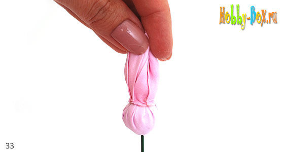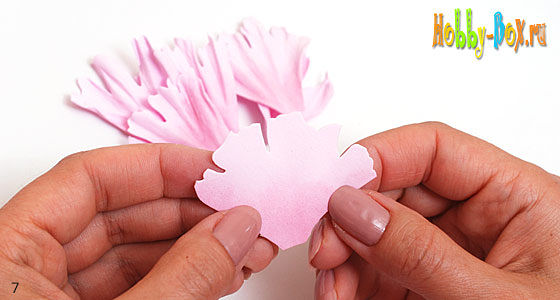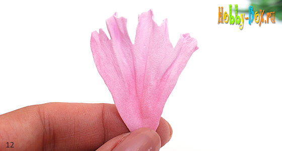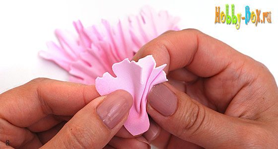 Верхнюю часть лепестка с прогофрируем по принципу обработки лепестков б, то есть складываем гармошкой и катаем между пальцами (большим и указательным), а серединку вытягиваем лодочкой, придавая при этом лепестку небольшую вогнутость.