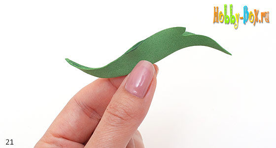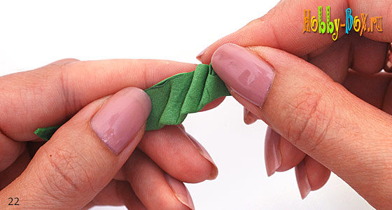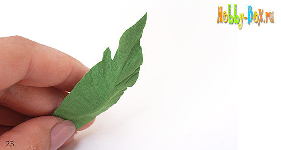 Гофрируем листья. Складываем лист пополам вдоль прожилок. У верхней части листа растягиваем края листа, у нижней — серединку (вдоль прожилки листа).