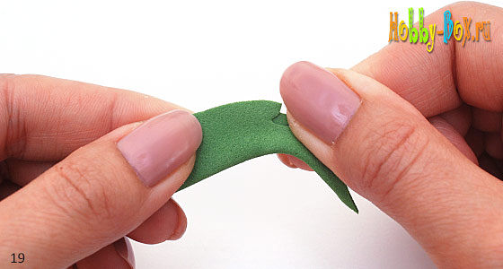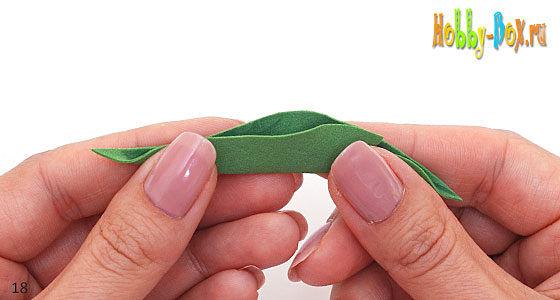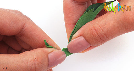 Теперь можно имитировать боковые прожилки, для этого складываем фоамиран мелкими складочками под острым углом, растираем и катаем его между пальцами (большим, указательными и средним).