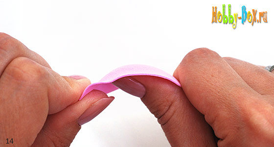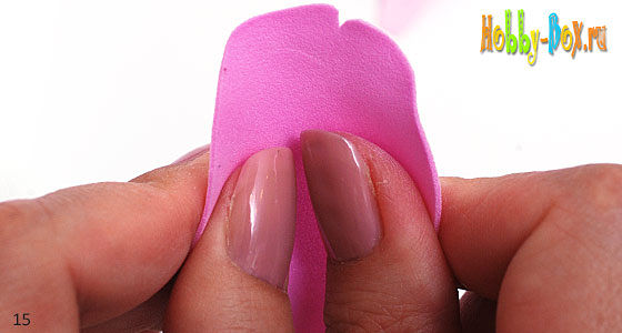 Форма лепестка д несколько другая, вогнутая как «лодочка». Чтобы создать углубление на лепестке, пальцами левой руки возьмитесь за верхний край лепестка, большой палец правой руки расположите по его центру и аккуратно потяните фоамиран, формируя большим пальцем углубление в центре и, придавая ему тем самым, округлую вогнутую форму.