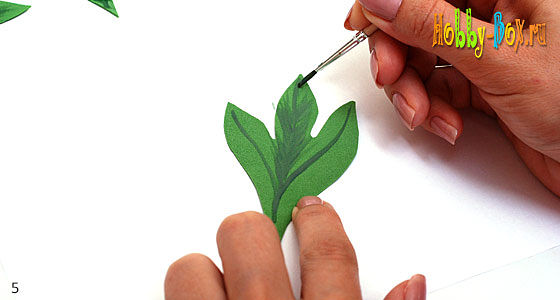 Чтобы листья пиона выглядели правдоподобно, мы их тоже слегка затонируем краской зелёного цвета более тёмного оттенка, чем цвет фоамирана. Сначала по центру трилистника проводим центральные прожилки и потом распределяем краску от центральных прожилок к краям листа.