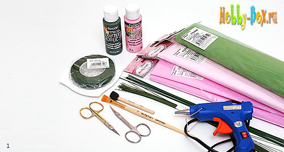 Толстая проволока для стебля 1–1.5 мм и тонкая проволока для листьев. Я использовала флористическую проволоку диметром 1.4 мм и тонкую проволоку Fleur № 26;