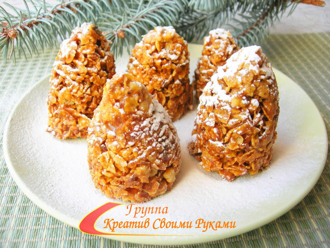 Смешиваем в емкости кукурузные хлопья, орехи, сгущенное молоко. Конусообразные рюмки емкостью 70-80 мл смачиваем внутри водой и помещаем в каждую чайной ложкой полученную смесь, слегка ее утрамбовывая. Отправляем в холодильник на 3 часа. По истечению 3 часов, вынимаем готовые шишки из рюмок, перевернув их вниз и помогая ножом. Выкладываем на тарелку и посыпаем сахарной пудрой.