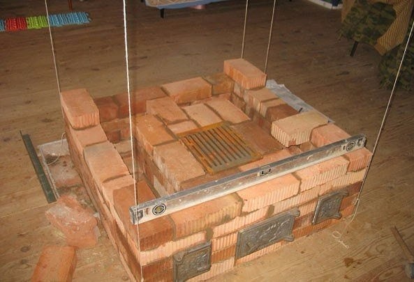 Второй ряд кирпичей укладывают сверху, таким образом, чтобы он расположился на одинаковом с полом уровне – после этого можно приступать к основной печной кладке. На подготовленной таким образом площадке с помощью рейки, правила и шпагата наносятся контуры будущей печи.