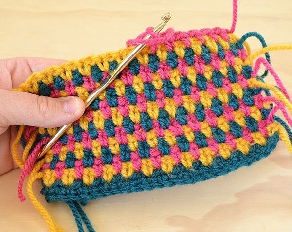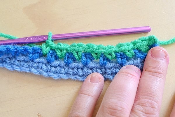 Меняем цвет нити и вяжем СБН следующий ряд таки образом: СБН, ВП, пропускаем петлю предыдущего ряда и снова вяжем СБН, ВП. И так далее до конца ряда.