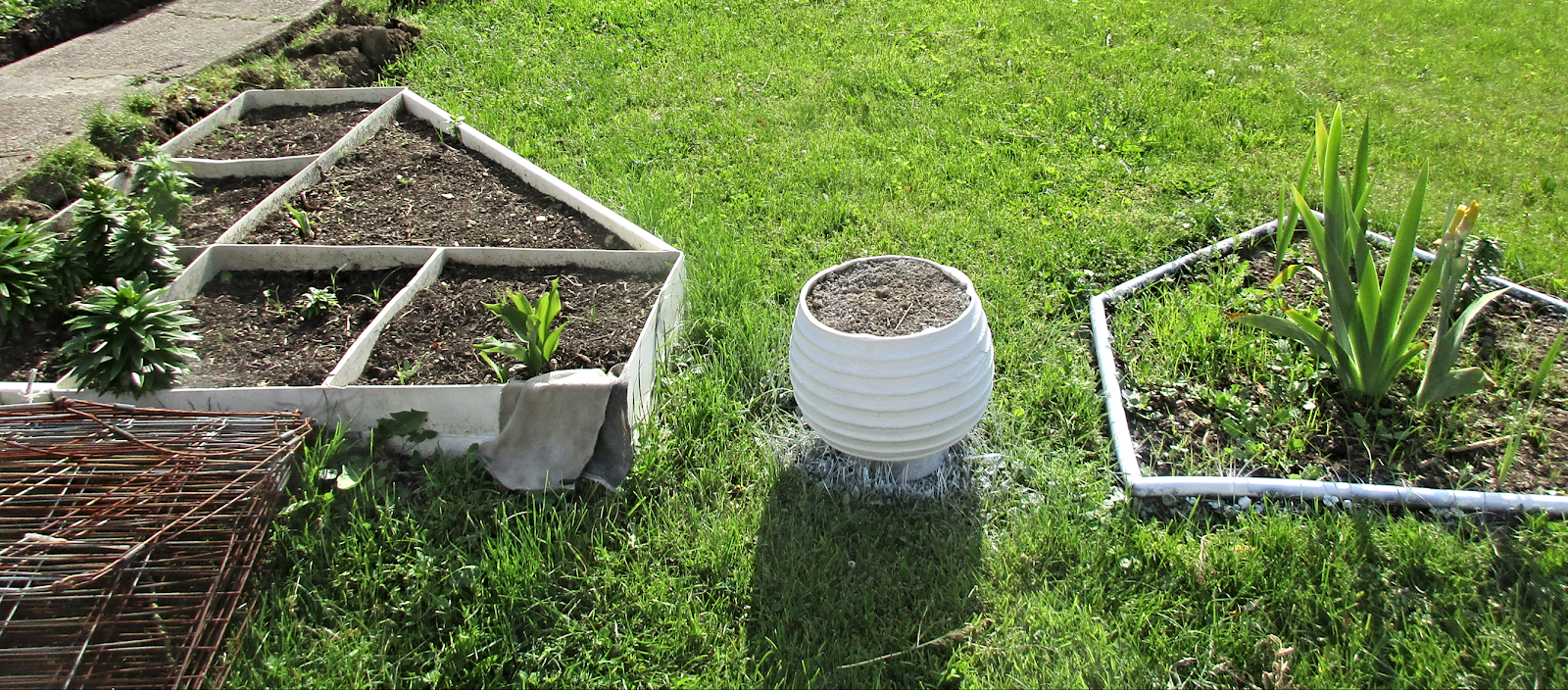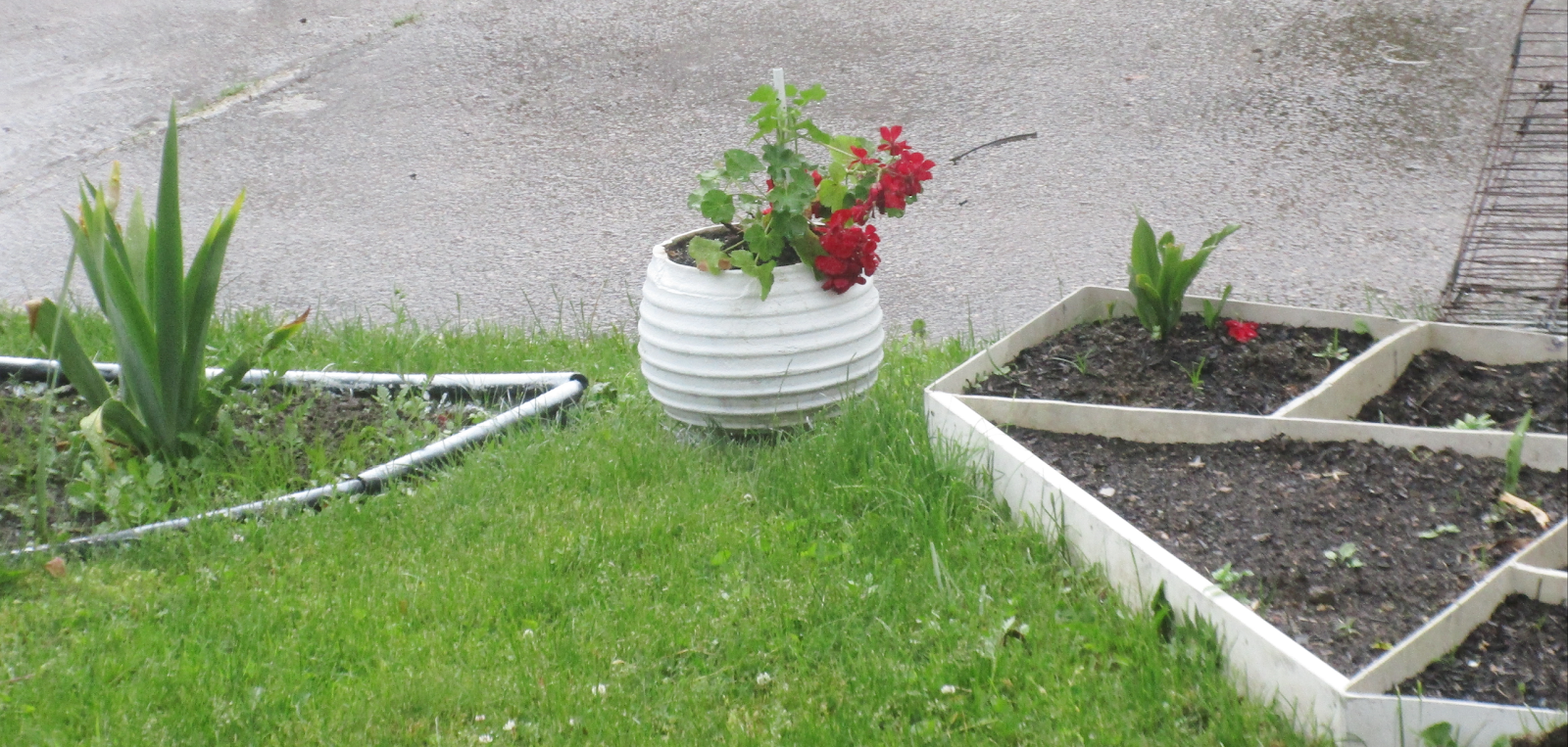 Мы эти клумбы будем разворачивать по-другому, после бетонирования дорожки. Тогда и горшок обретёт другое место, а пока так: