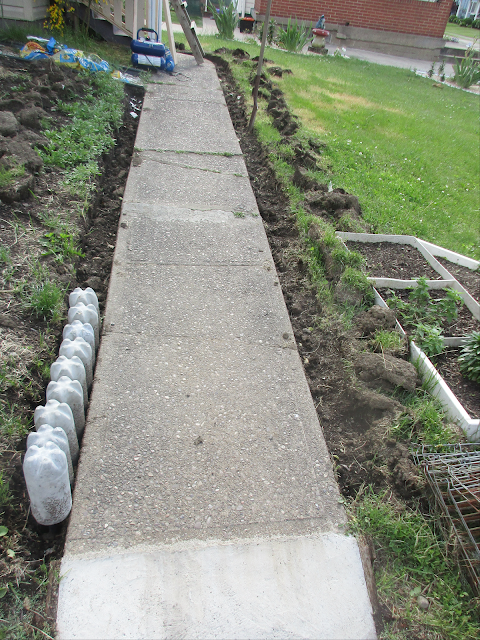 Две траншеи по бокам(по 20 см)-я сама прокопала, пока Игорь занимался другой работой.Траншея слева заполнится формовками, а траншея спрева заполнится бетоном, и это даст расширение дорожке.