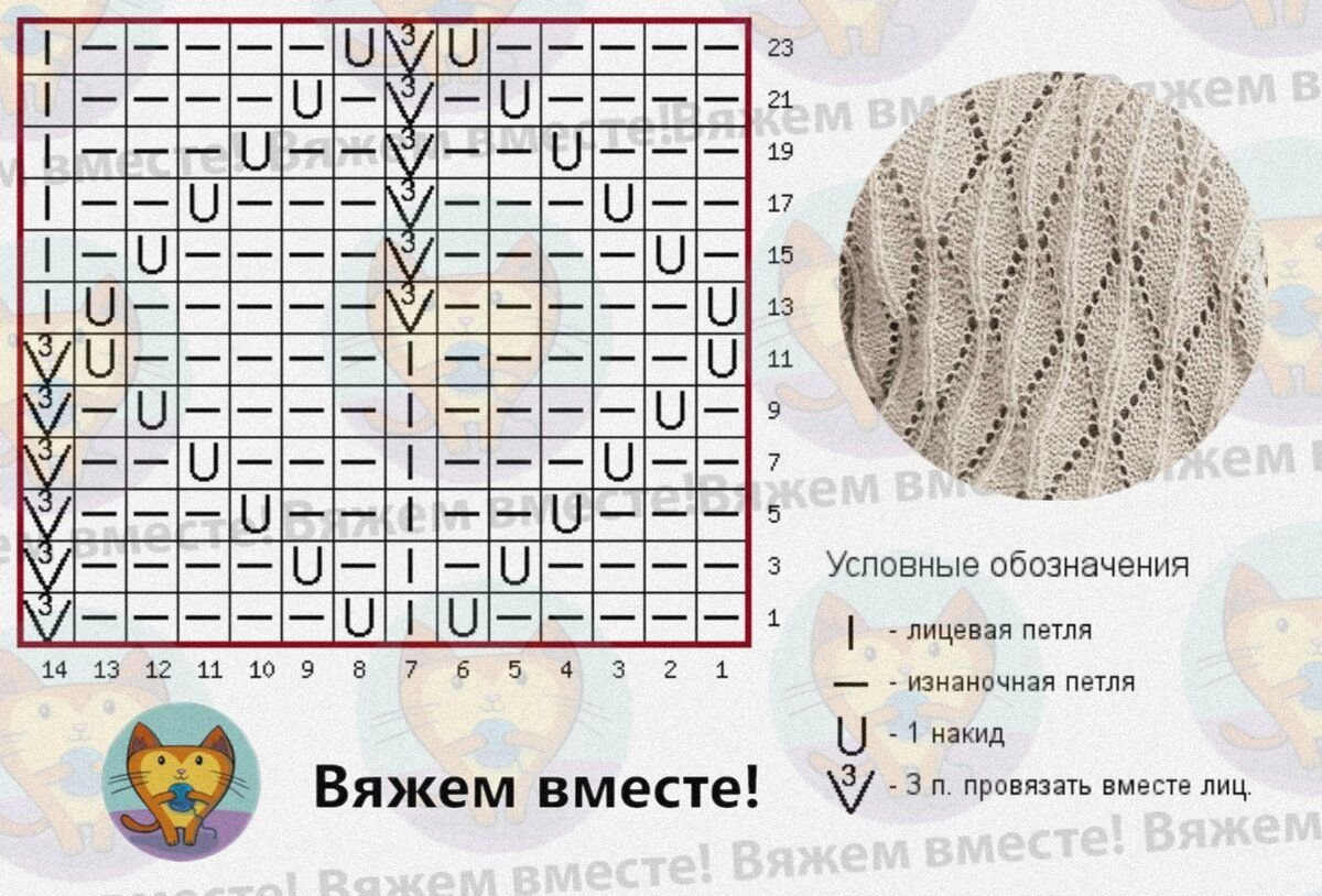 Раппорт узора составляет 14 петель по ширине и 24 ряда по высоте. В данной схеме двойные убавления важно провязывать так, чтобы центральная петля (лицевая) лежала сверху.