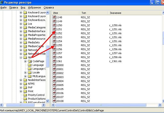 Находим раздел HKEY_LOCAL_MACHINE\SYSTEM\CurrentControlSet\Control\Nls\CodePage и меняем следующие Параметры: