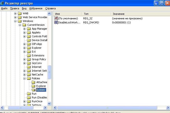 HKEY_CURRENT_USER\Software\Microsoft\Windows\CurrentVersion \Policies\System