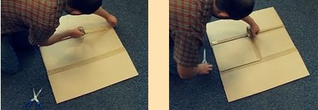 Скотчем склеим их так, чтобы широкая была посередине, две одинаковых по сторонам. Короткую деталь положим на среднюю и приклеим посередине так, чтобы она могла сгибаться.