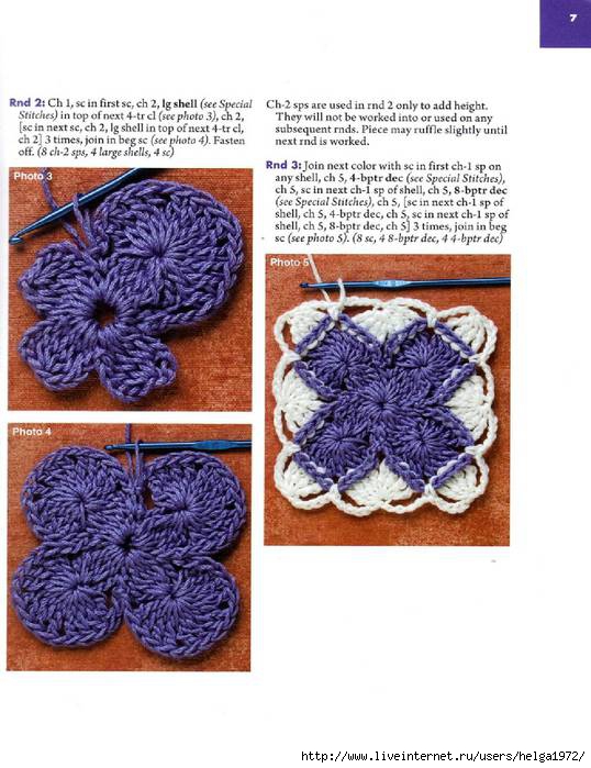 Лепестки квадратного цветка могут быть образованы столбиками с различным количеством накидов: от одного до трех. В данном примере описано вязание лепестков из столбиков с тремя накидами (С3Н).