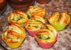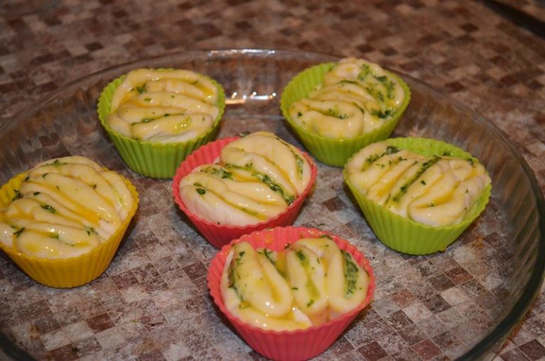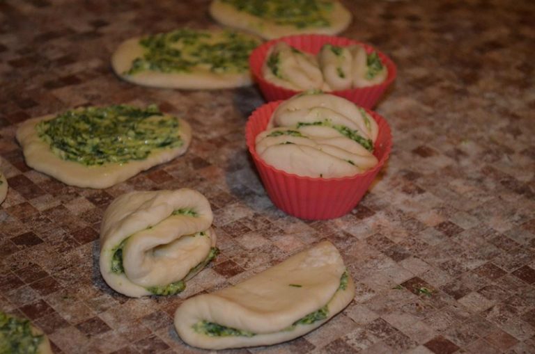- Подошедшее тесто обомни, скатай в колбаску, которую потом нарежь на небольшие ломтики. Каждый ломтик раскатай в лепешку, по центру которой выложи немного начинки. Сложи кружочки 4 раза и помести по 2–3 штуки в формочки для маффинов.