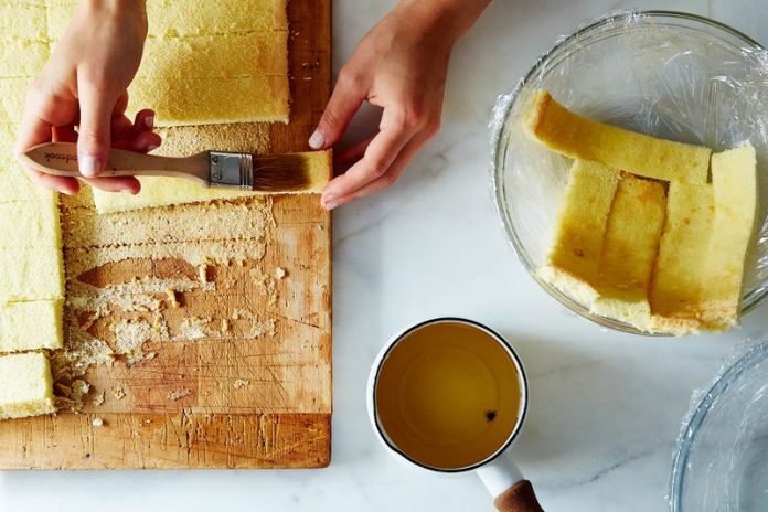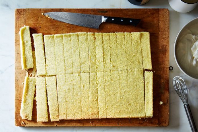 Вы можете купить или сделать бисквит . Затем, разрежьте торт на прямоугольные полосы или квадраты.