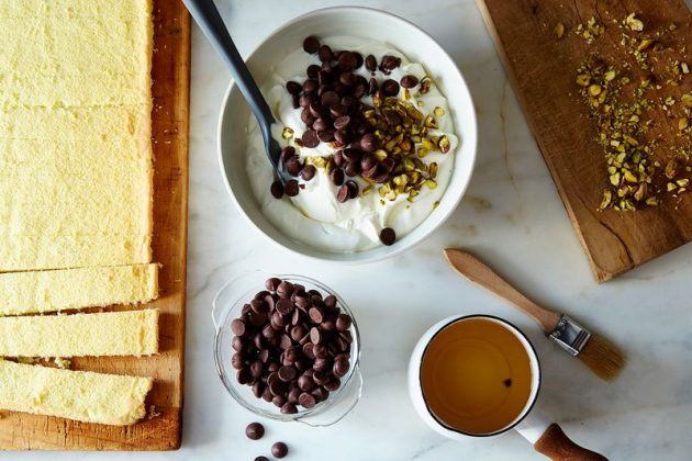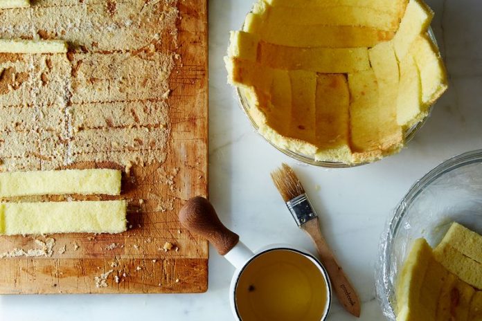 Пропитайте обе стороны полосочек ликерным сиропом и выложите их внутри формы!