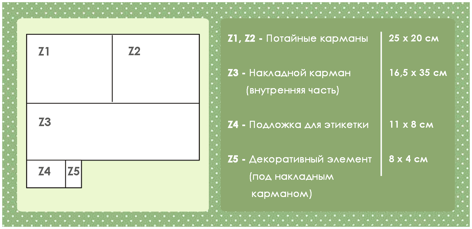 Моя сумка будет состоять из одного большого внутреннего отдела. С одной стороны накладной карман разделенный на три сегмента. На противоположной стороне потайной карман на молнии. Будет еще один карман на молнии на внешней стороне сумки.