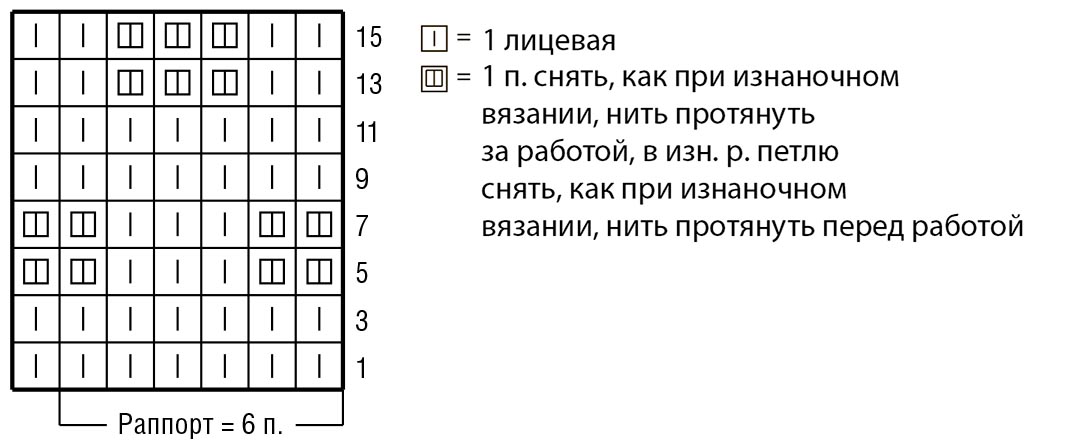 Если в условных обозначениях не указано иначе, в изнаночных рядах все петли провязывать изнаночными.