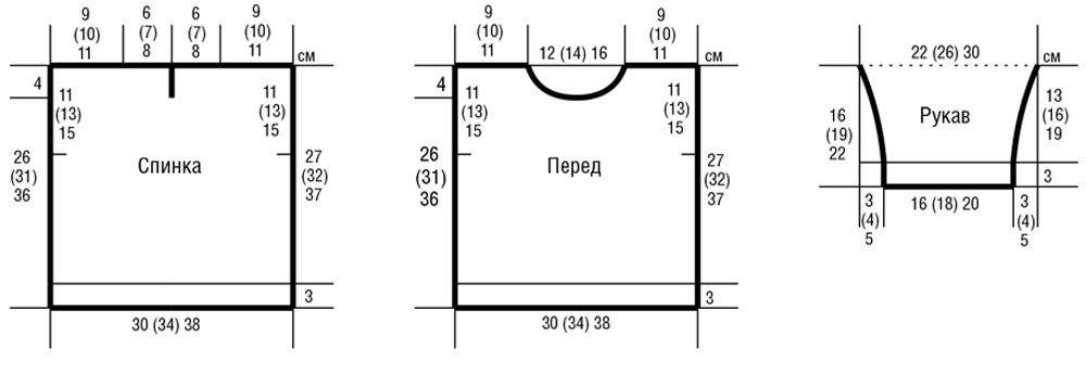 Для пройм с обеих сторон от плечевого шва отмерить по 11 (13) 15 см и прикрепить в этих местах маркеры. Затем открытые петли рукавов прикрепить между маркерами по краям переда и спинки и пришить строчным швом.