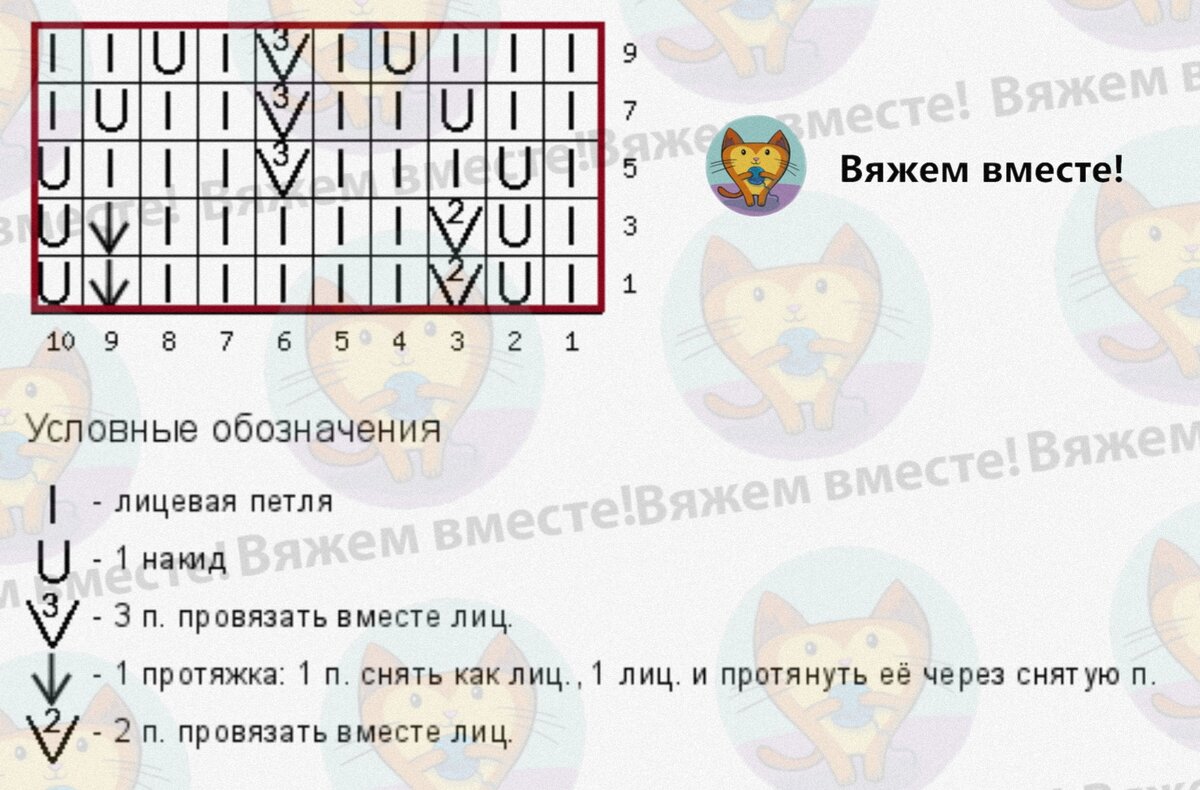 Один раппорт узора составляет 10 петель по ширине и 10 рядов по высоте, выделен красной рамкой. Чётные ряды не даны на схеме и вяжутся лицевыми при вязании по кругу и изнаночными при вязании поворотными рядами.